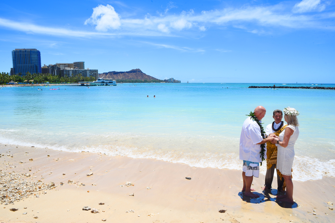 Happy couple renews their wedding vows at Leahi Beach Park. Walking distance from New Otani Kaimana Beach hotel. Also walking distance to QUEENS BEACH.